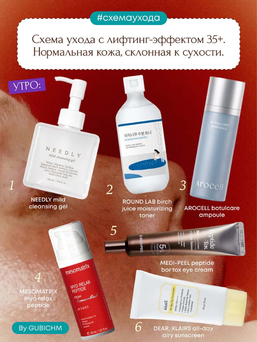 #схемаухода с лифтинг-эффектом 35+. Нормальная кожа, склонная к сухости. И пример ухода для тех, кто не знает, с чем сочетать ретинол в другие дни.