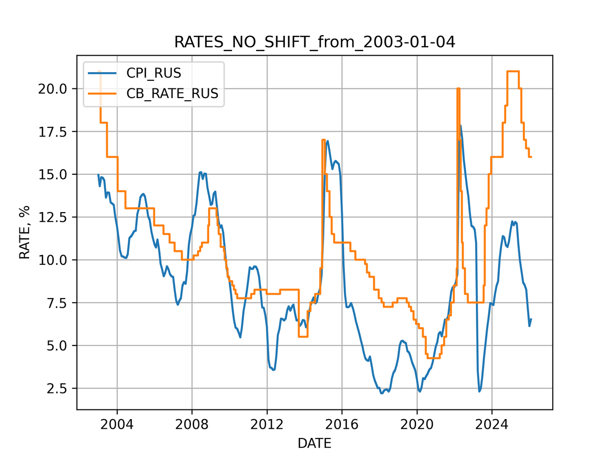 В информационном поле по мере приближения заседания ЦБ РФ по ставке всегда наблюдается повышение активности. Проводятся опросы экспертов, публикуются консенсус прогнозы и отдельные мнения. В частных каналах и соц сетях идут собственные голосования. А за озвучиванием решения вообще следят в оба глаза, стараясь уловить в разъяснениях возможные подсказки на будущее. Всё это исходит из соображений, что центральным банкам (и не только в России) подвластна инфляция и они могут ей управлять. Но так ли это на самом деле? Давайте немного посчитаем. Если посмотреть на график, то визуально кажется, что худо-бедно ЦБ РФ справляется с задачей управления инфляцией (CPI_RUS - годовая инфляция, CB_RATE_RUS - ключевая ставка (ранее рефинансирования)). Общие тенденции вроде прослеживаются. Однако, если посчитать корреляцию между инфляцией и ставкой, то окажется, что она равна всего 0.6, что в естественных науках признали бы не значимым значением. Правда в гуманитарных значения корреляции от 0.5 до 0.7 р