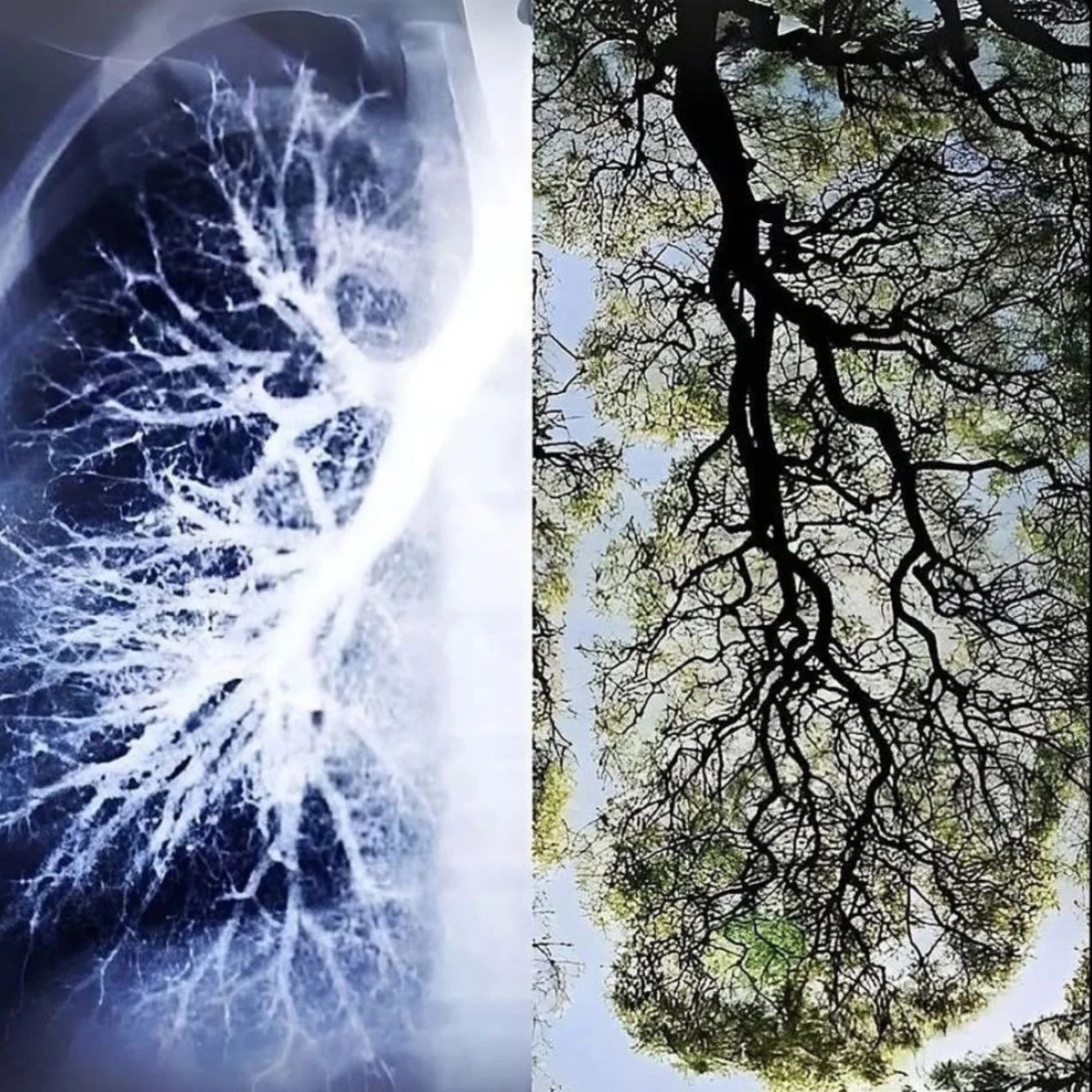 • Легкие и Крона Дерева: Вы когда-нибудь задумывались, почему эти два образа так похожи? Разветвленная структура наших легких, бронхиальное дерево — это дословное зеркало кроны, которая тянется к небу, или корней, уходящих в землю. Мы — это космические легкие планеты, дышащие в едином ритме с лесами.