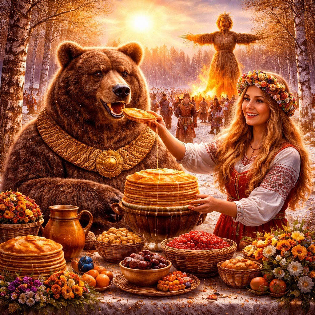 Самая сильная фигура Комоедицы — конечно, медведь. И здесь надо избавиться от городской слащавости. Медведь в этом празднике — не зверушка из сказки и не добродушный лесной символ. Это тяжёлая, зимняя, тёмная, глубинная сила мира. Он спит, когда земля как будто умерла. Он шевелится, когда в земле пошла жизнь. Он выходит, когда весна уже не обещание, а факт. Именно поэтому в описаниях Комоедицы так важна “медвежья” логика: медленная еда, неторопливые движения, перекатывания с боку на бок, подражание зверю после трапезы. Люди не просто играли. Они входили в образ пробуждающейся силы природы. Медведь здесь — календарный двигатель, а не маска для смеха.