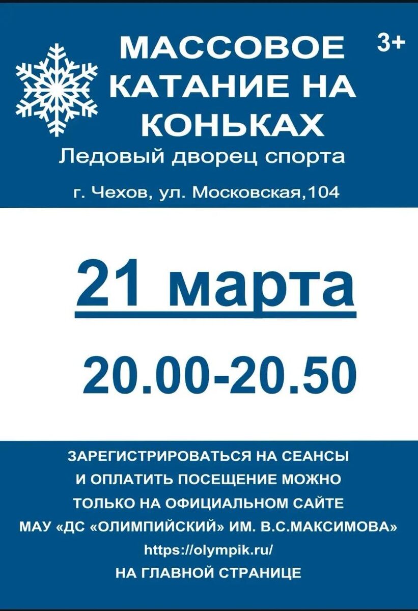 ✨ Массовое катание на коньках в Ледовом дворце ⛸️ Сеанс 20:00 - 20:50 🎵 К вашим услугам качественный лед, хорошая музыка, прокат и заточка коньков. ℹ️ Размеры коньков: с 27 по 46. 💵 Стоимость проката: детские 200 руб., взрослые 300 руб. 📆 21.03.2026 🕛 20:00 🏢 Ледовый дворец спорта «Витязь» 📍 г. Чехов, ул. Московская, д.104 🔗 Купить билет: https://clck.ru/3NsBk2 ⭐Поддержать канал голосом ✅ Мероприятия Чехов https://dzen.ru/id/66cc4b48e9ef144699238a51 https://vk.ru/chekhov_events http://dzen.ru/chekhov_events