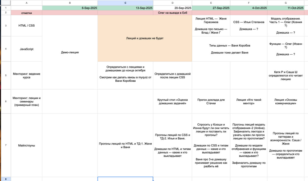 В нашей текущей команде активно распространены пульты производства — простая, но эффективная механика ведения проектов, которой хочется поделиться. Пульт — это таблица (чаще всего в Excel или Google Sheets), где: — по горизонтали идут проекты / подпроекты / конкретные люди; — по вертикали — недели; — в ячейках на пересечении указываются действия, задачи и вопросы, которые нужно закрыть в конкретную неделю. На практике на еженедельных встречах команда открывает Пульт и идёт построчно: — что сделано на прошлой неделе; — какие долги остались; — что с текущей неделей; — стоит ли что-то подвинуть или переприоритизировать. Вопросы, которые висят без ответа, тоже фиксируются в Пульте — и не теряются. Если проект многоуровневый, то он может занимать несколько строчек. Эта практика мне на столько понравилась, что я применил её к лекциям в университете и сделал такой же Пульт (скриншот к посту) с расписанием лекций, дедлайнами по домашкам, открытым вопросам от преподавателей и ответственным