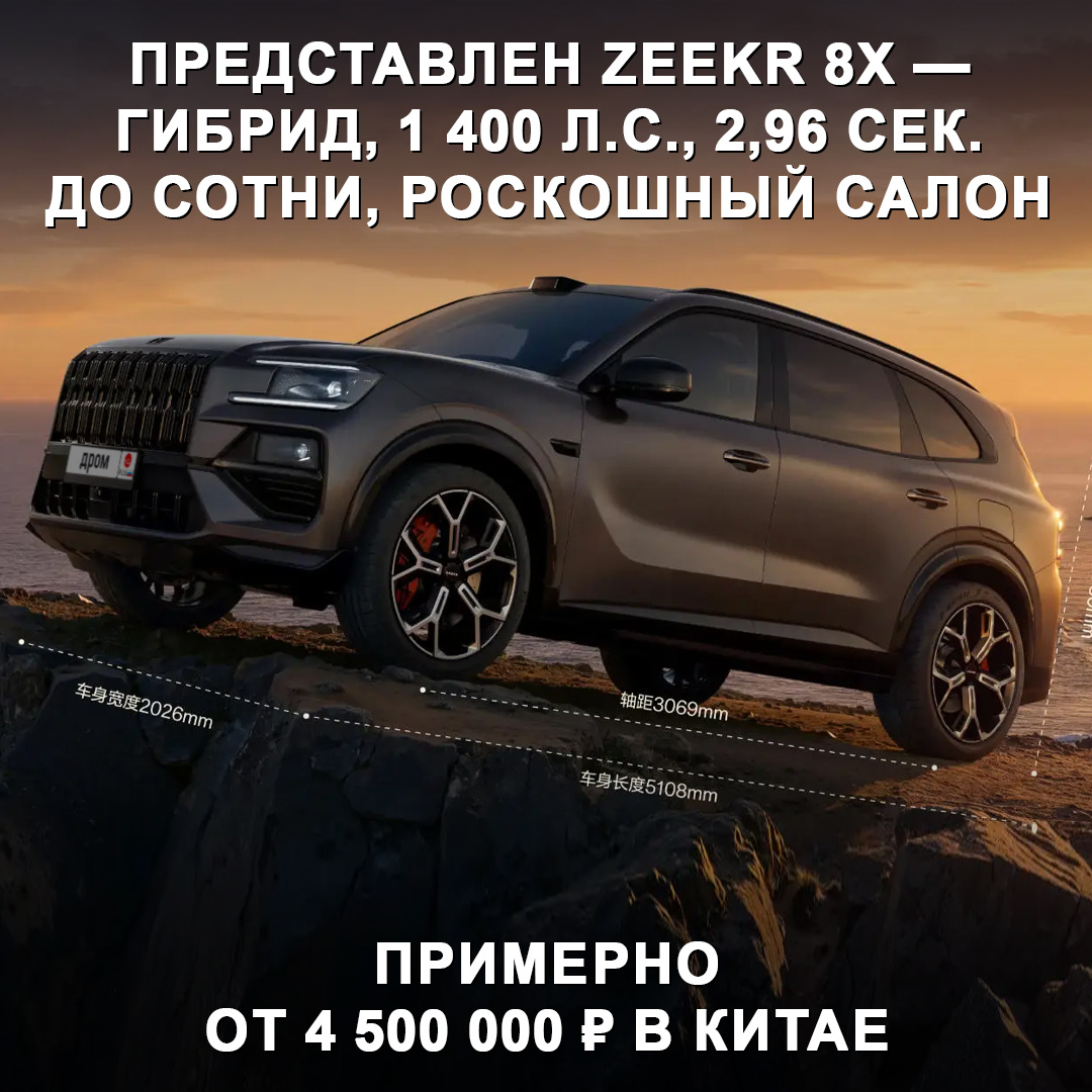 Это 5,1-метровый автомобиль с колёсной базой 3,1 м. В салоне у него два или три ряда, в последнем случае — с креслами повышенной комфортности с массажем, вентиляцией и опорой для голеней. Также среди оснащения — мониторы, включая потолочный для пассажиров, столики, холодильник, шторки на окнах с электроприводом. У новинки 2-литровый турбомотор на 280 л.с. и два или три электродвигателя, которые в топе выдают 1 400 л.с. Максималка машины — 230 км/ч. Запас хода с полным баком и заряженной батареей — 1 416 км. Цена в Китае — примерно от 4 500 000 ₽. Как думаете, будут к нам активно завозить или не стоит того, чтобы переплачивать за утильсбор? 🤔 #дромновость #китай #zeerk #8x #гибрид