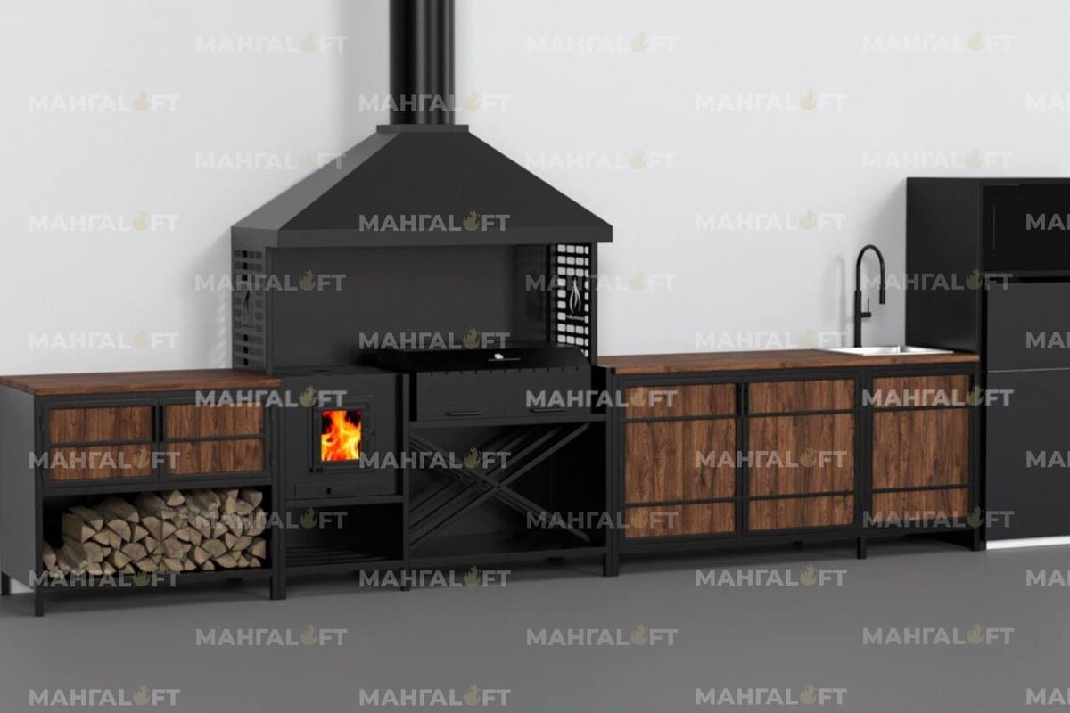 Комплекс продумывался как полноценная уличная кухня с удобной рабочей зоной и дополнительными модулями. Основные характеристики: — толщина стали жаровни и печи 5 мм 🔥 — каркас из профильной трубы 30×30 мм — вытяжка с нашими фирменными боковыми стенками — порошковая покраска каркаса Размеры: Жаровня — 80 × 45 × 20 см Печь — 50 × 50 × 50 см В проекте также предусмотрены дополнительные модули: — ниша под холодильник — модуль под стиральную машину — рабочие модули с полками для хранения Получилась продуманная мангальная зона, где есть всё необходимое для готовки и хранения 🔥