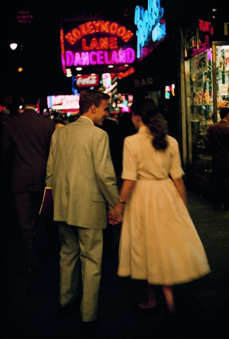 Подростки, как настоящие искатели приключений, прогуливаются по улицам города, который никогда не спит. Они, вероятно, обсуждают, кто из них круче — Джеймс Дин или Элвис Пресли, и мечтают о том, как однажды станут звездами. 🌃✨ Вокруг них сверкают огни, и каждый уголок полон загадок. Кто знает, может, именно в этот момент они нашли бы свою судьбу или хотя бы хороший бургер? В общем, это время, когда жизнь была проще, а мечты — ярче!