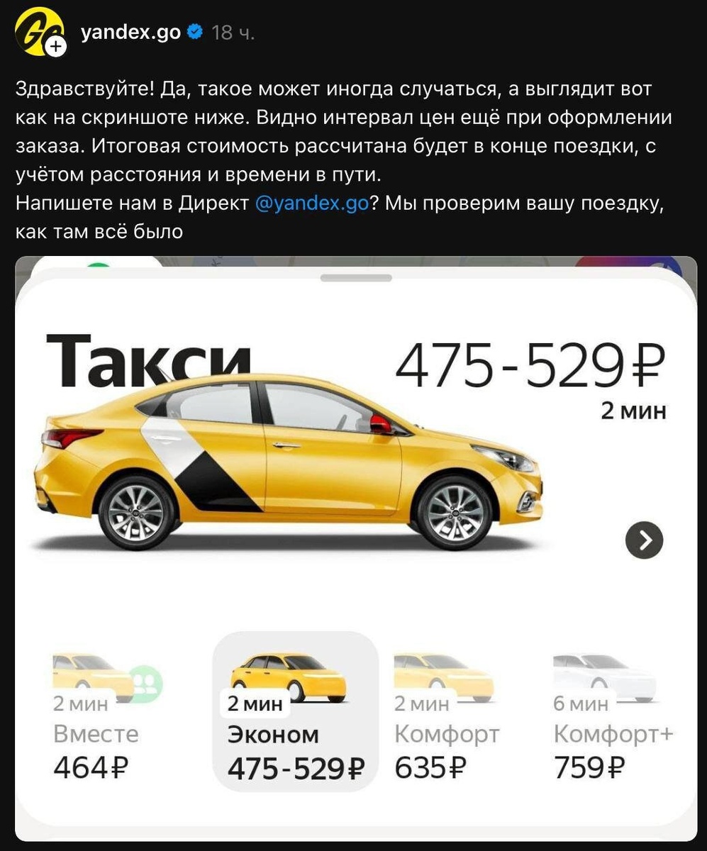 При заказе машины будут показывать интервал вместо точной суммы. Конечный прайс будет известен по окончанию поездки. Когда и почему такое появляется, компания не уточнила.