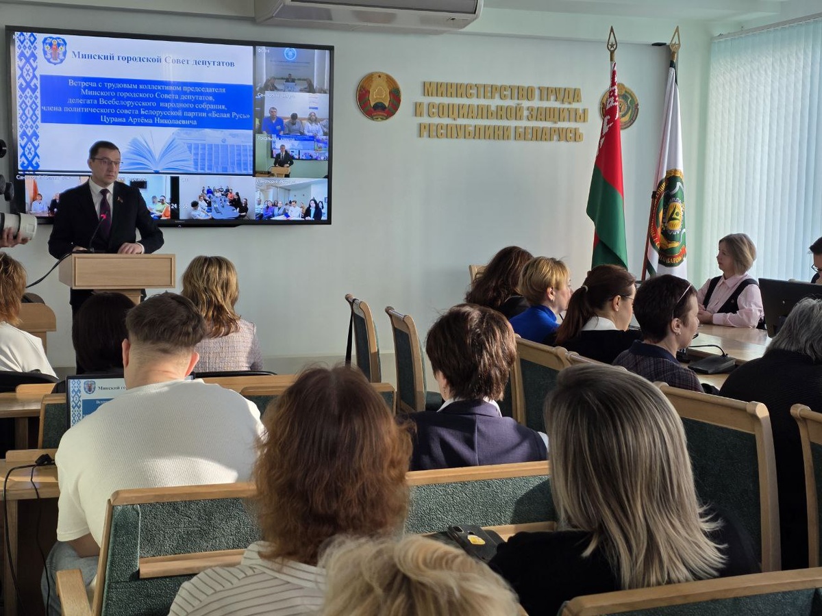". Артём Цуран провел ЕДИ в Минтруда и соцзащиты Председатель Минского городского Совета депутатов Артём Цуран провел единый день информирования в Министерстве труда и социальной защиты. 💪Основной темой стало развитие регионов. Особый акцент в своем выступлении он сделал на деятельности Минского городского Совета депутатов, подробно остановившись на механизмах взаимодействия с жителями города. ‼️Артём Цуран подчеркнул, что вся работа депутатского корпуса Минска направлена на создание комфортной городской среды. Одним из ключевых инструментов для этого становятся гражданские инициативы. ✅14 инициатив от жителей Минска реализовано в 2025 году. ✅Роль Совета депутатов заключается в активном сопровождении их на всех этапах — от идеи до реализации. ➡️Жители приходят с идеей (например, обновить двор или сделать площадку), депутаты сопровождают проект от чертежа до воплощения. Механизм софинансирования (10% от инициативной группы / 90% из бюджета).