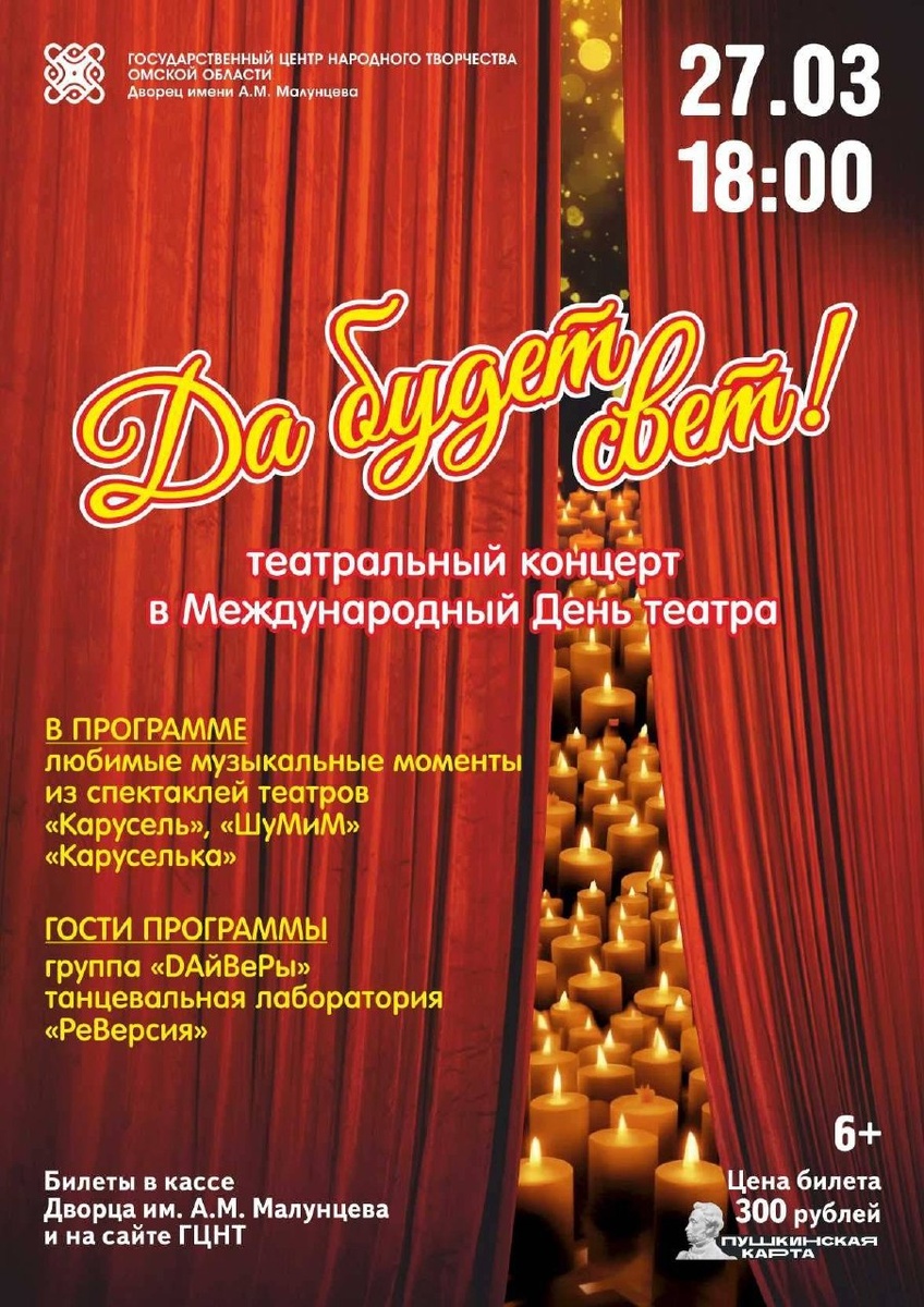 Концерт с музыкальными моментами из спектаклей театров Карусель, ШуМиМ и Каруселька, совместно с группой DАйВеРы и танцевальной лабораторией РеВерсия. Создание светлой атмосферы радости через синтез музыки, танца и живого слова. Начало: 27 марта 2026 18:00 Стоимость: 300.0 руб. Адрес: г Омск, пр-кт Мира, д 58 Организатор: https://vk.com/public98057764 Важнейшая дата для всех театралов — День театра! 27 марта в 18.00 приглашаем вас на театральный концерт в Международный День театра «ДА БУДЕТ СВЕТ!» Это возможность вернуться к любимым музыкальным моментам из спектаклей «Кай, ты лучше всех!», «Над облаками всегда светит солнце», «Чудеса Леди Мэри», «Балаганчик», «Я никогда нем забуду детство», «Футбол море и прочие глупости» , «Антарктида», «Ос(ч) ень... #развлечения_современная_музыка Узнать подробности, адрес или записаться на событие.
