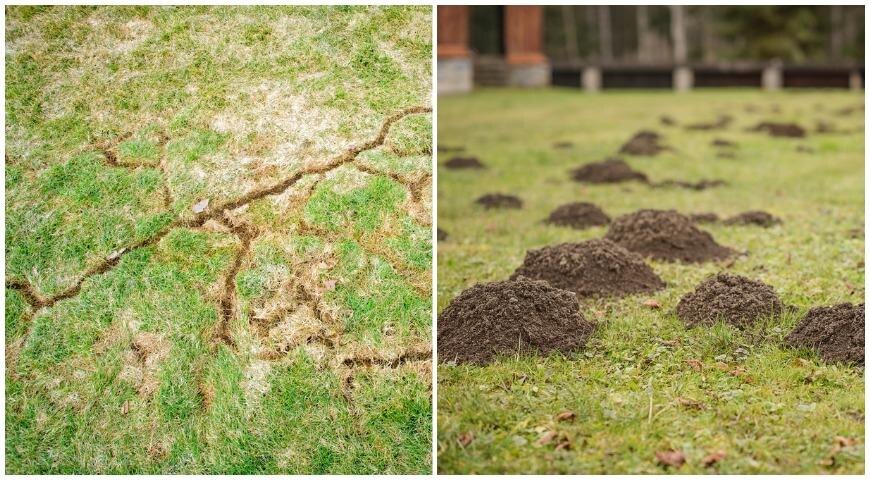 Признаками повреждения кротами являются приподнятые туннели по всей лужайке, наличие кротовьих нор, а также повреждение травы и корневых систем растений.
