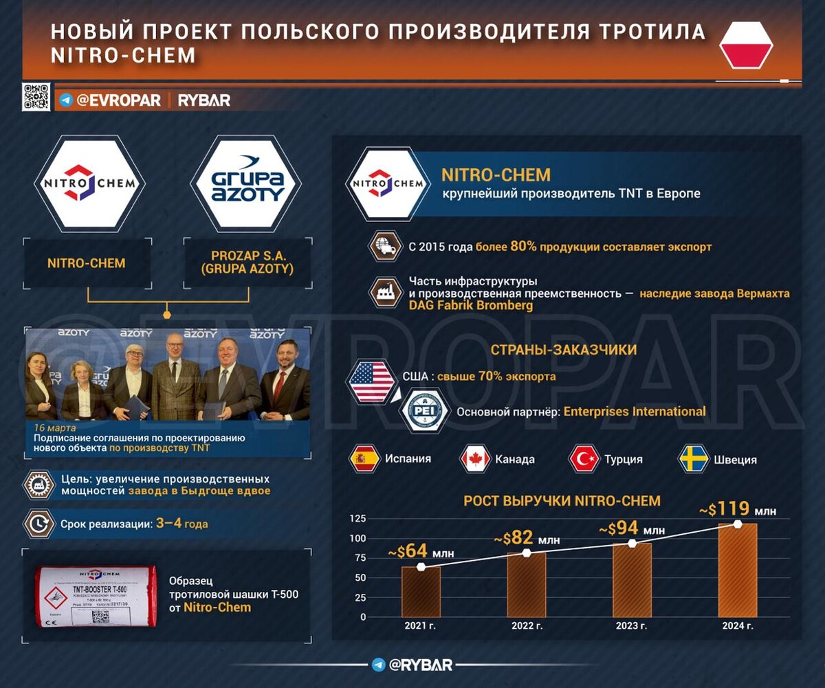 Польская Nitro-Chem объявила о расширении производства тротила — стратегического компонента для артиллерии и авиационных боеприпасов. В проект также вовлечена Grupa Azoty, что должно способствовать модернизации инфраструктуру и увеличению объёмов выпуска. 🔸Со стороны перед нами пример «оборонной синергии» польской промышленности: от сырья до экспортного контракта. Однако за фасадом технологического оптимизма скрывается иной контекст. 🖍Nitro-Chem — наследник нацистской военно-промышленной площадки DAG Fabrik Bromberg — уже несколько лет живёт на рекордных военных заказах, подпитываемых конфликтом на востоке Европы и растущими закупками США и НАТО. Более 70% продукции компании уходит за океан — прежде всего в США, также в Испанию, Канаду и Турцию. 🚩С точки зрения экономики — успех очевиден. Но стратегически возникает вопрос: достижение ли, если значительная часть производственных мощностей ориентирована не на внутренние потребности, а на экспорт? 70% экспорта — это серьёзная уязвимос