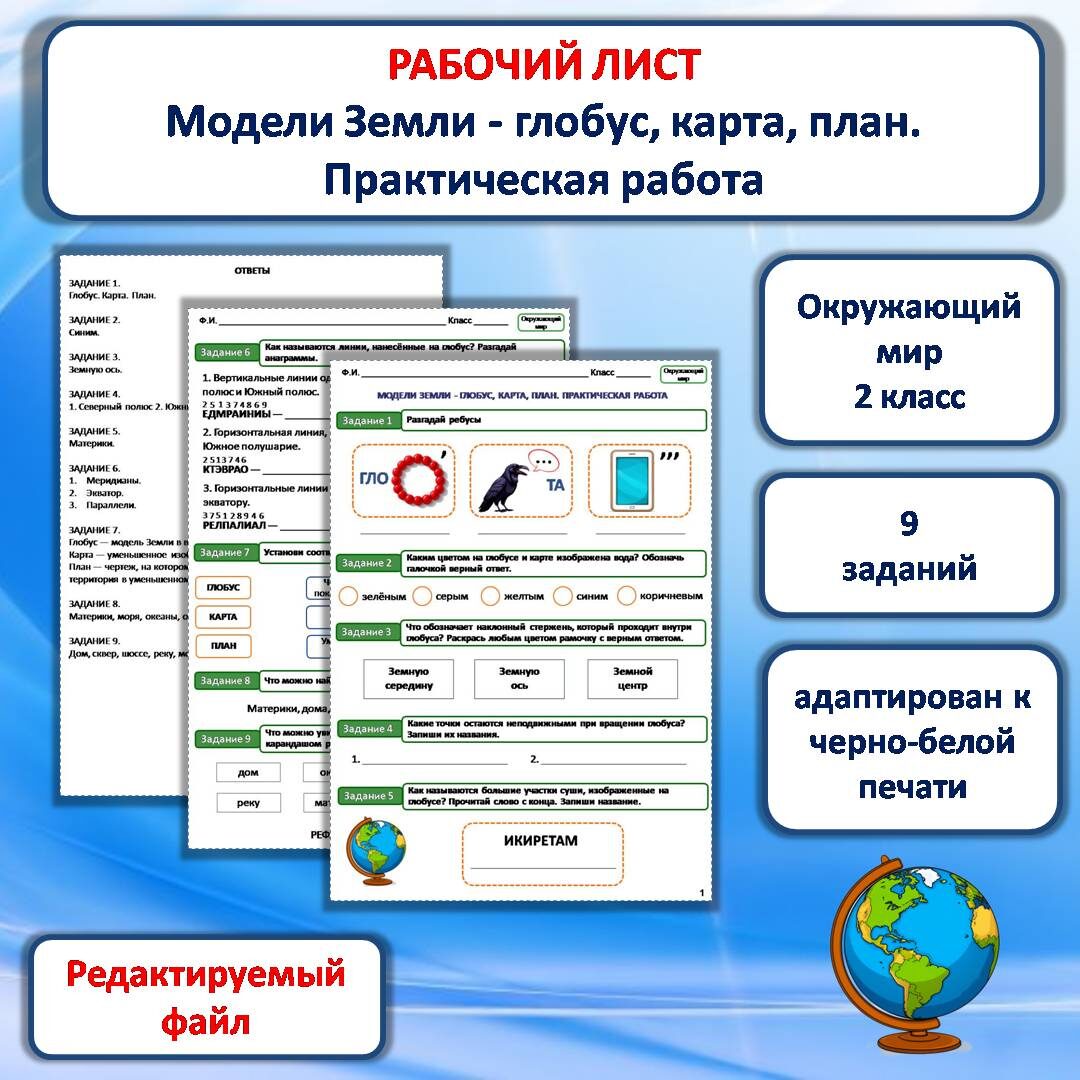 Рабочий лист скачать здесь Возможно, вам пригодится конспект, составленный к данному уроку. Конспект урока скачать здесь Рабочий лист «Модели Земли - глобус, карта, план. Практическая работа» разработан к уроку окружающего мира во 2 классе. Рабочий лист состоит из девяти заданий, расположенных на двух листах. На третьем листе даны ответы. Задания рабочего листа выстроены в логической последовательности. Задание 1. Разгадав ребусы, дети узнают, что на уроке они познакомятся с глобусом, картой и планом. Задания 2-6 нацелены на знакомство с глобусом. Учащиеся узнают, что: Задание 7 нацелено на запоминание отличий между глобусом, картой и планом. Задания 8-9 нацелены на более глубокое понимание отличительных признаков между картой и планом. Задания рабочего листа разнообразны и интересны. В рабочий лист включены ребусы и анаграммы, представленные в доступной для второклассников форме. В анаграммах зашифрованы сложные термины, изучаемые на уроке. Данная разработка станет ценным помощником д