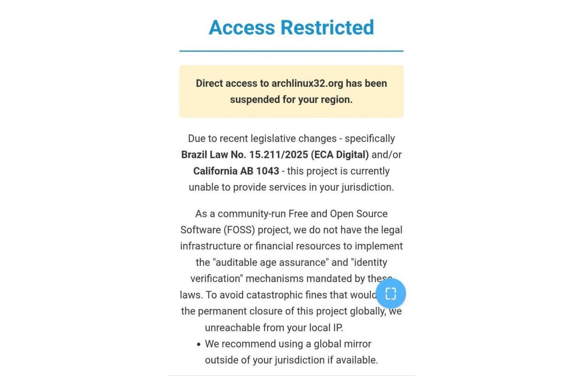 Платформы внедряют инструменты проверки возраста, некоторые сопротивляются, у пользователей всплеск интереса к трёхбуквенным сервисам. Классика. Огоньку добавило то, что сумрачный законодательный гений потребовал внедрить проверку и разработчиков ОС. После этого в сообществе линуксоидов начался сущий кошмар — кто застал горячие обсуждения в рассылке, тот знает. Часть дистрибутивов блокирует доступ из Бразилии по IP, как форк ArchLinux32, MidnightBSD внесла в лицензию запрет юзерам из Бразилии и злачных мест США пользоваться дистром — в части штатов аналогичный закон. Бразилия грозит безумными штрафами и блокировками, так что вопрос непраздный, особенно для опенсорса. Но это закон от тех же грамотеев, что угрожали своим гражданам штрафом в ~9к долларов в день за доступ к заблокированному X, так что удивляться нечему. Держат планочку, так сказать. @tomhunter