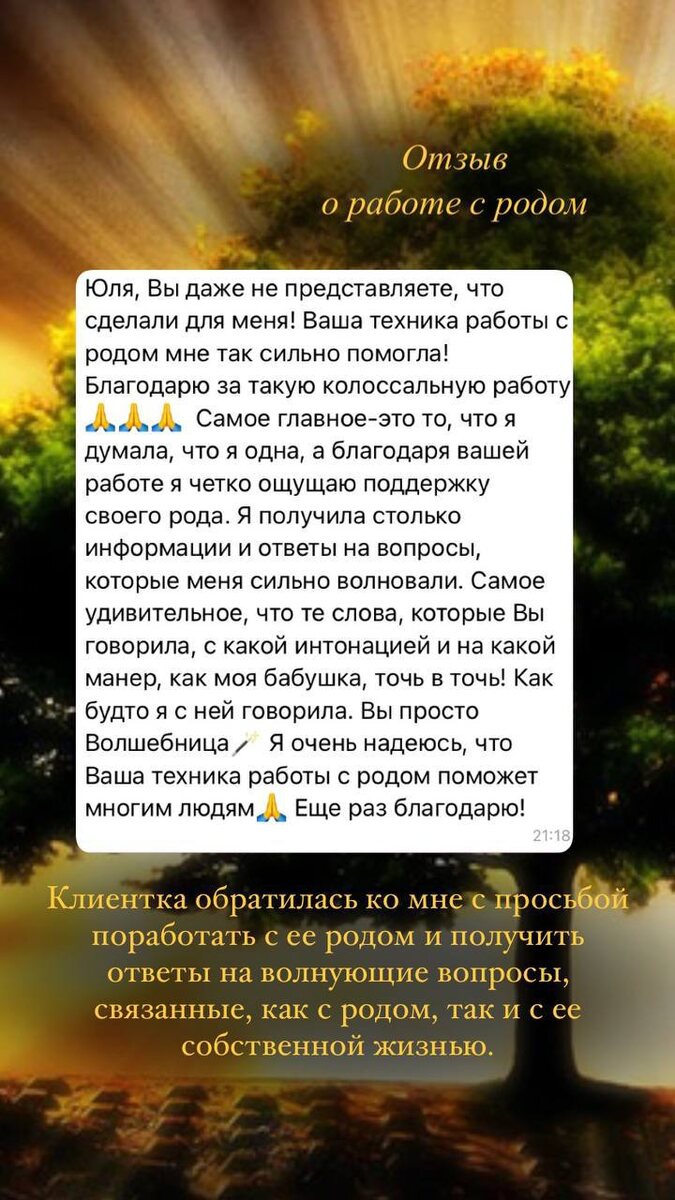 Зачем я это делаю? Читая отзывы других людей, вы можете обнаружить похожие ситуации, эмоциональные состояния или вопросы, которые есть и в вашей жизни тоже и которые вы хотели бы решить. Я хочу, чтобы вы знали, что методов и способов решения огромное множество. Просто необходимо подобрать тот инструмент, который подойдет именно вам. ✅ГИПНОТЕРАПИЯ ✅Работа С ЭНЕРГЕТИКОЙ ✅Работа с МЕТАФОРИЧЕКИМИ АССОЦИАТИВНЫМИ КАРТАМИ ✅Работа с РОДОМ ✅Обережные мешочки, программные свечи, ведьмины бутылочки, обрядовые куклы, энергетические картины... Наверняка здесь найдется то, что вам нужно. Мне можно написать и я с удовольствием отвечу на ваши вопросы ➡️@frolovajulia_specialist #отзывы