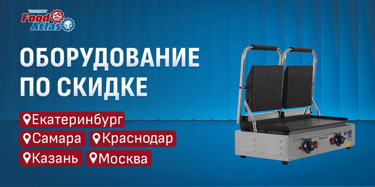 Хотите пополнить парк техники выгодно? Сейчас отличный момент: мы предоставили скидки на оборудование Foodatlas, которое уже ждёт вас на наших региональных складах. До 31 марта вы можете забрать технику напрямую или заказать доставку из удобного города. Участвуют склады в пяти городах: Ассортимент большой - более 300 позиций для ресторанов, пекарен, цехов и магазинов. Вот лишь несколько примеров: Акция распространяется на десятки других моделей: холодильное и тепловое оборудование, тестомесы, упаковщики, слайсеры и многое другое. Уточняйте наличие и цены у менеджеров компании. Предложение ограничено, успейте забрать технику по специальной цене! МЫ НА СВЯЗИ