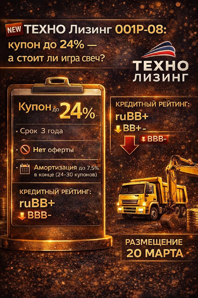 ? ООО «ТЕХНО Лизинг» работает на рынке с 2007 года. Специализация - финансовая аренда транспорта и оборудования для корпоративных клиентов. #техно_лизинг 📋 Параметры выпуска 001Р-08 - Купон: до 24%, ежемесячно - Срок: 3 года - Объём: 476 млн руб. - Амортизация: по 7,5% в даты 24, 27, 30, 33 купонов 🚫 Оферта: нет - Номинал: 1 000 руб. - Организатор: Велес Капитал - Доступен неквалифицированным инвесторам - Размещение запланировано на 20 марта 💼 Кредитный рейтинг: ru🅱️🅱️+, прогноз «развивающийся» Рейтинг был понижен с ru🅱️🅱️🅱️-. Причина - рост объёма изъятого имущества на балансе и затягивание сроков его реализации. Не самый приятный сигнал прямо перед новым размещением. ————————————— ➡️ Финансы за 9 мес. 2025 г. (РСБУ) ➖ Активы: 5,88 млрд руб. (-1,2% с начала года) ➖ Собственный капитал: 539,9 млн руб. (+28%) ➖ Выручка: 1,6 млрд руб. (+39% г/г) ➖ Чистая прибыль: 117,9 млн руб. (рост в 2,3х г/г) ➖ Чистый долг: 4,8 млрд руб. (+7%) ➖ ЧД/Капитал: 8,9х (было 10,5х) ➖ OCF: -181 мл