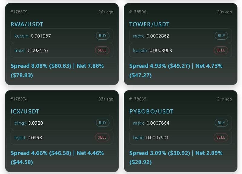 %? 🤖 Всем привет! Даже новички знают, что связки бывают в арбитраже без карт на разных инструментах 🤝 На скриншоте связки с нашего @Cexdexbot_bot и я дам рекомендации как работать с данными проектами/биржами. Торгуются они очень часто и по ним почти всегда есть хорошая разница в моменты ликвы ☝🏾 ❗️ Вы по-любому уже знаете, что такое тир1,2,3 биржи. Так вот первое правило стабильности в межбирже это сочетатать эти биржи между собой. Байбит и Бинанс между собой редко показывают связки. 🛫Связка по $RWA 8% чистого спреда и связка с $TOWER. Тут классика жанра, две тир 2 биржи со средними объемами где путь логистики вашего токена будет таким: лимитка откуп части депа - перевод, в идеале если вы торгуете с хай депом и параллельно берете хедж на каком-либо из перекупленных токенов, далее по лимитке продажа после зачисления первой пачки токенов , далее по кругу пока есть спред. * тут важно, в последних роликах по дексам я ни раз показывал что руками так же люди крутят сутками одну и ту