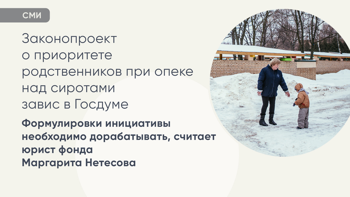 Инициатива предлагает поправки в Семейный кодекс и ст. 10 закона об опеке и попечительстве. Авторы законопроекта считают, что зачастую опеку над детьми-сиротами получают «профессиональные опекуны», в то время как родственники не успевают подать все необходимые документы. В проекте они предлагают установить приоритет воспитания детей в той семье, в которой они были рождены (т. е. в родной семье), и создать очередность опекунов при устройстве ребенка. Юрист программы «На стороне ребенка» благотворительного фонда «Волонтеры в помощь детям-сиротам» Маргарита Нетесова отмечает, что идея законопроекта важна, т.к. бывают ситуации, когда родственники ребенка даже не знают, что он попал в детдом. Но принимать в текущем виде инициативу нельзя, ее формулировки необходимо дорабатывать, считает юрист. Сама по себе очередность родственников не отражает реальных жизненных ситуаций и не учитывает индивидуальный подход: к кому из взрослых у ребенка сформировалась привязанность, принимали ли они участие