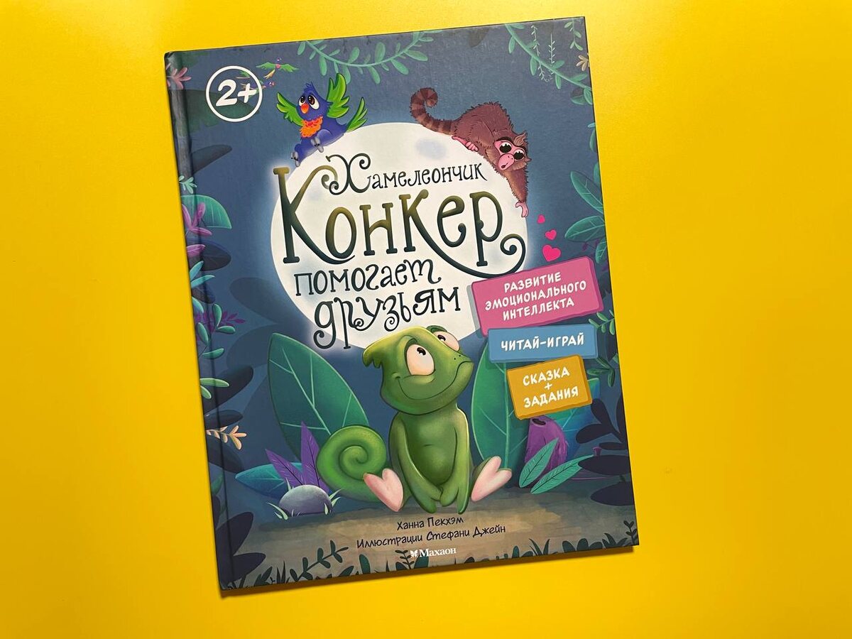 В книге «Хамелеончик Конкер помогает друзьям» (издательство Махаон) у Конкера появляются друзья, которым срочно нужна поддержка. Попугайчик потерялся и так перепугался, что уже не знает, куда лететь и кому доверять. А обезьянка попала в ловушку и не может выбраться. Конкер, кажется, должен включить героя… но вместо этого сначала сомневается: а вдруг я не справлюсь? а если сделаю только хуже? И вот в этом моменте книга особенная — она честно показывает ребёнку, что страх и неуверенность бывают у всех. Дальше история разворачивается так, как в жизни: Конкер не становится сверхсмелым за одну страницу. Он просто делает шаг за шагом то, что может — слушает, успокаивает, ищет решение, зовёт на помощь, не бросает друзей одних. И постепенно ребёнок считывает главную мысль: настоящая сила часто прячется не в «храбрости без страха», а в доброте, внимании и готовности быть рядом, когда другому трудно. Текста ровно столько, сколько нужно для дошкольника: короткие фразы, понятные ситуации, бе