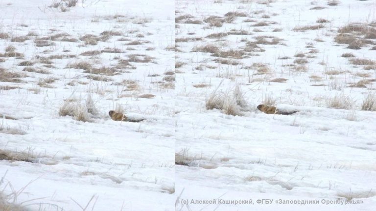 В Оренбургской области впервые этой весной смогли запечатлеть на фото выход сурка из норы. Долгожданное появление степного обитателя сфотографировал старший государственный инспектор участка «Айтуарская степь» Алексей Каширский. Сурок выбрался из норы, вышел на снег и замер, рассматривая окрестности. Фото вышли не самыми чёткими — осторожный зверёк был далеко и не собирался позировать. Но главное: весна в степи зафиксирована официально!, — сообщают «Заповедники Оренбуржья». Как ранее писал «Оренбург Медиа», в заповедниках Оренбургской области сурки проснулись еще в конце февраля, но их первый выход удалось зафиксировать только 15 марта. Тогда удалось увидеть только открытую нору и следы животного. Фото: «Заповедники Оренбуржья»