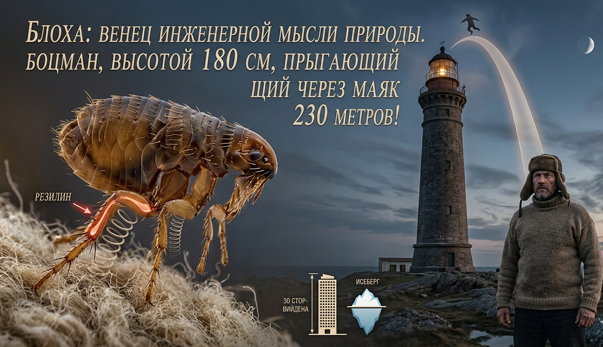 Проведем эксперимент. Представьте нашего боцмана — здорового мужика ростом метр восемьдесят. Если бы природа наградила его такими же пропорциями силы, как у обычной блохи, он бы не просто подпрыгнул. Он бы с места, без разбега, перемахнул через маяк высотой в 230 метров! Это выше, чем тридцатиэтажное здание, это почти полет в стратосферу на собственных двоих.
