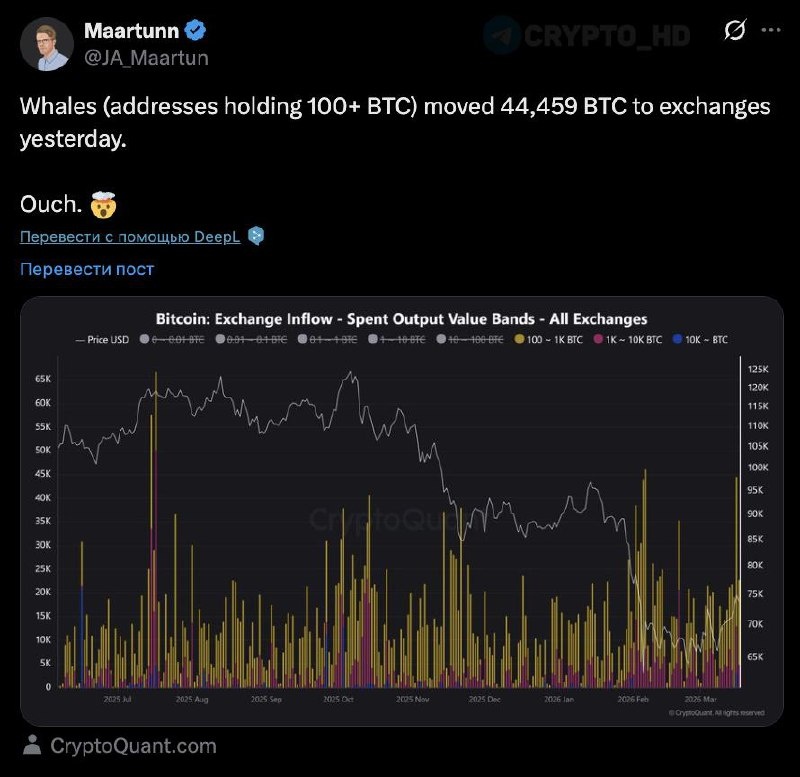 👀 CryptoQuant: Киты перевели 44,459 BTC ($3,3b) на биржи за вчерашний день.