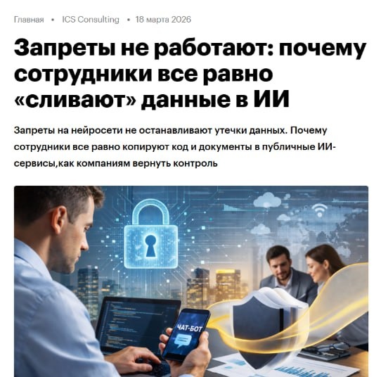 использование ИИ и утечки данных. Пока компании пытаются ограничить доступ к внешним нейросетям, сотрудники находят способы обойти запреты, создавая неконтролируемые риски для бизнеса. Проблематика: почему «запретить» — это не решение? — Иллюзия контроля. Полная блокировка ChatGPT или аналогичных сервисов в корпоративной сети не работает. Сотрудники используют личные устройства, чтобы ускорить рутинные задачи, отправляя в облако конфиденциальные отчеты, код или данные клиентов. — Конфликт эффективности и безопасности. ИИ дает колоссальный прирост производительности. Запрещая его, компания либо проигрывает в скорости конкурентам, либо толкает персонал в «серую зону» использования технологий. — Отсутствие культуры данных. Проблема не в самой технологии, а в отсутствии четких регламентов: что можно доверять алгоритмам, а что должно оставаться внутри периметра. Для руководителей это вопрос и операционной устойчивости. Утечка интеллектуальной собственности через ИИ-запросы сегодня мож