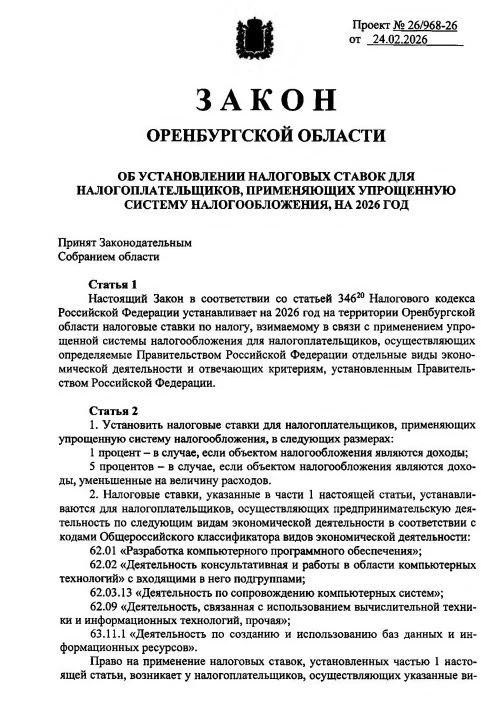 👍 📄 Законодательное Собрание Оренбургской области приняло закон о возврате сниженных ставок для ряда категорий малого бизнеса на УСН