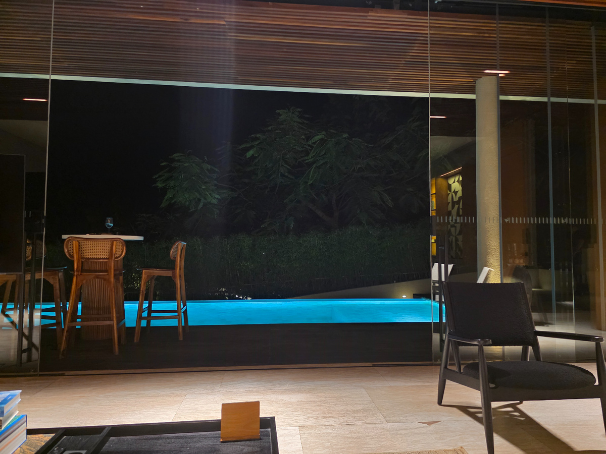 На фото — реальная вилла. Вечер. Закрытая панорамная терраса с витражным остеклением от пола до потолка. За стеклом — светящийся бассейн, тропические деревья, полная тишина снаружи. Внутри — тёплый свет, деревянные рейки на потолке, плетёные барные стулья, бокал вина на столе.