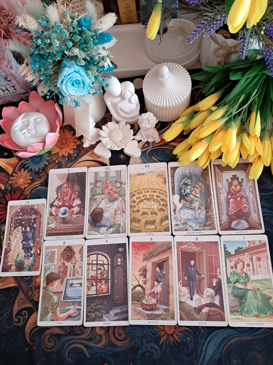 Перед вами открыты все двери: и к богатству (Туз Пентаклей), и к признанию (6 Жезлов), и к любви (Рыцарь Кубков). Единственное условие — слушайте свою интуицию (Верховная Жрица) и помните, что конечная цель — это гармония и радость (Солнце, Мир, 10 Кубков).