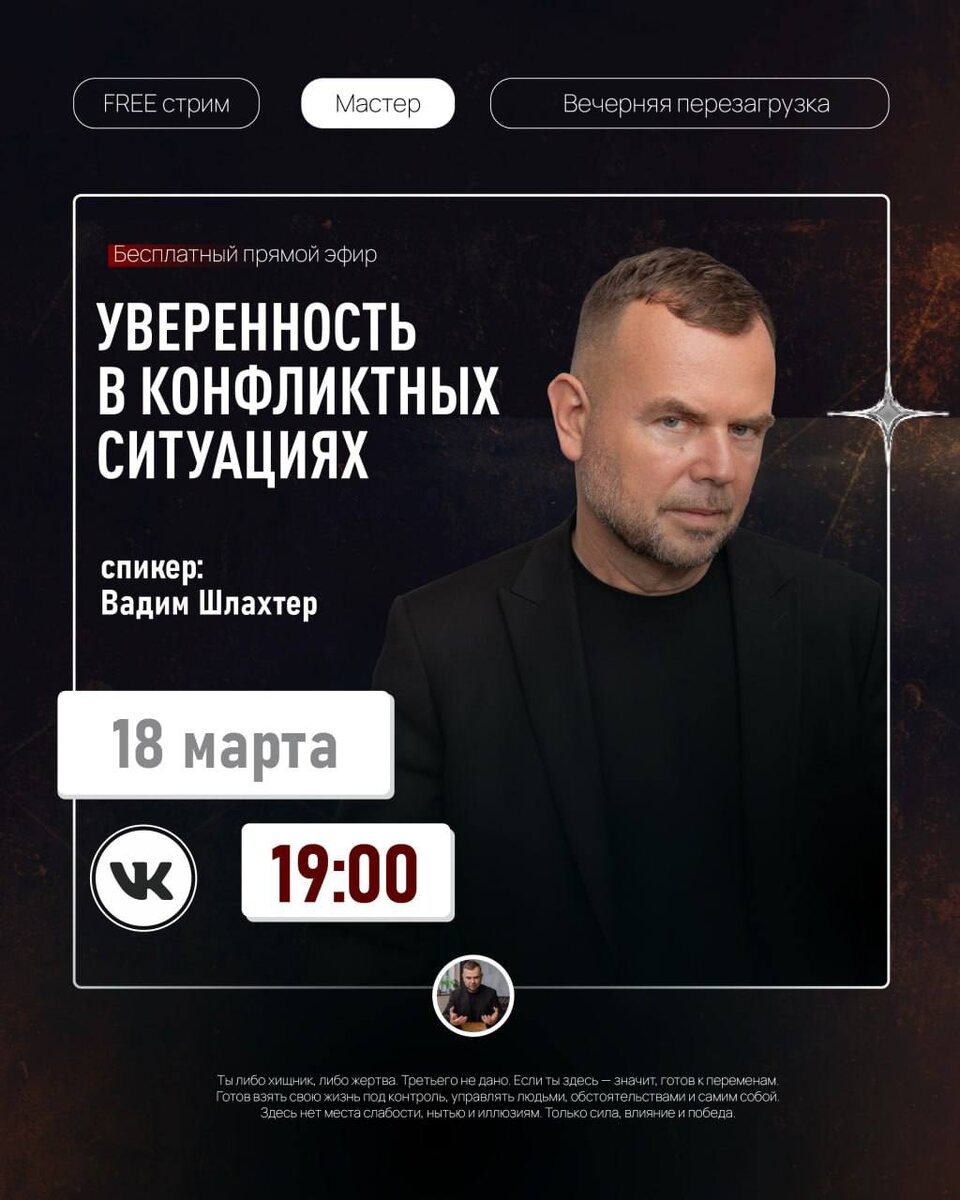 » Задавай свои вопросы по теме в комментариях к этому посту. На все отвечу в прямом эфире. ⏳ 18 марта в 19:00 (до 30 минут) 🕙 Подключайся только Вконтакте. Я провожу «Вечернюю перезагрузку» каждую среду. Запись эфира выложу в частном канале. Обо мне | Благодарность команде | Навигация