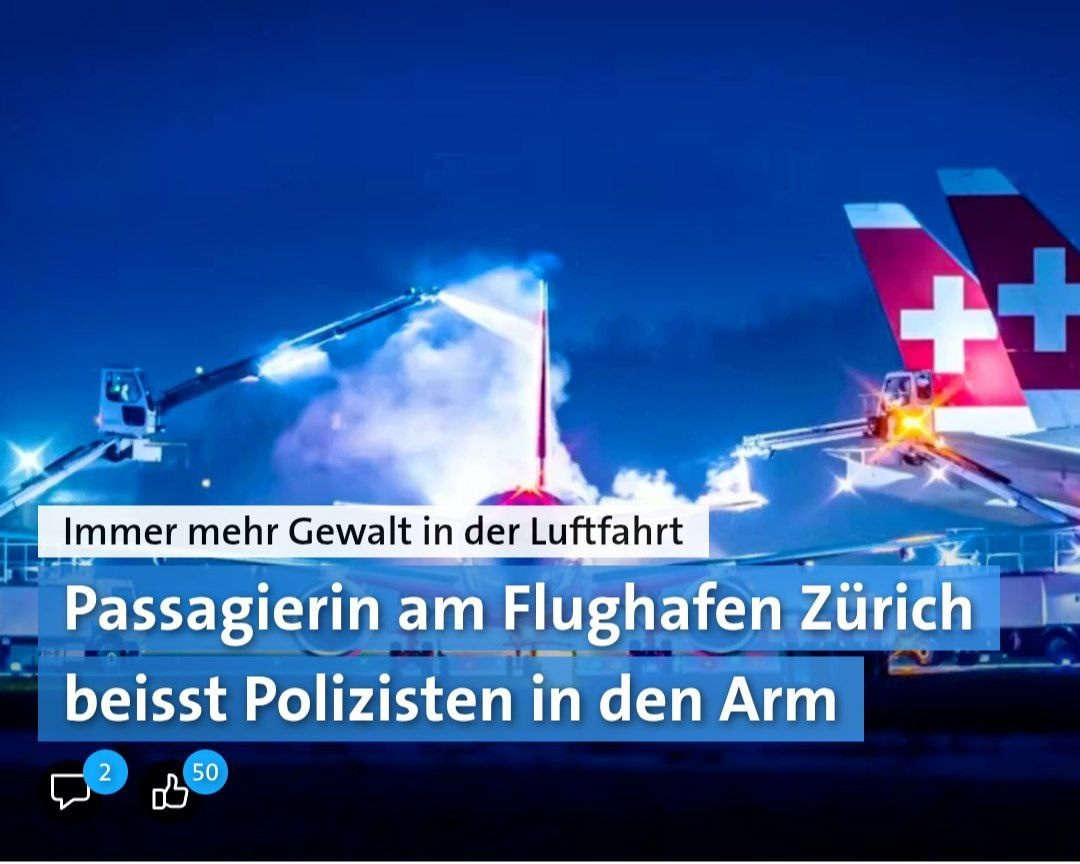 По данным Bundesamt für Zivilluftfahrt, число инцидентов с руганью, чрезмерным употреблением алкоголя и агрессивным поведением в 2025 году выросло на 17 % по сравнению с предыдущим годом. Инциденты происходят не только в воздухе, но и на земле. Один особенно серьёзный случай произошёл в Flughafen Zürich в августе 2024 года. Там в зоне Dock E гражданка Швейцарии устроила настолько сильный скандал, что для урегулирования ситуации пришлось вызвать полицию. Однако о спокойной деэскалации речи не шло: женщину пришлось повалить на землю и задержать. Её затем перенесли с терминала на взлётное поле к полицейской машине. Во время задержания она пиналась и укусила полицейского за руку, причинив ему следы укуса и лёгкую опухоль. 32-летнюю женщину задержали до 1 часа ночи, после чего ей предъявили обвинения в насилии и угрозах в отношении представителей власти. Позже она была осуждена по упрощённой процедуре: 90 дневных ставок по 30 франков (всего 2700 франков) плюс 800 франков судебных изде