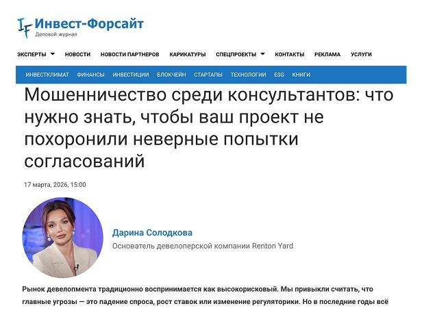 📌Вышла новая статья в деловом журнале «Инвест-Форсайт» о том, как один «знающий человек» с обещанием всё согласовать может завалить даже очень перспективный проект. Вы уже видите, как ваш спортивный объект живёт. Люди играют, общаются, возвращаются снова. Деньги привлечены, договорённости есть, движение началось. А потом появляется консультант, который говорит: «я знаю, как всё согласовать». И именно после таких уверенных обещаний у многих объектов начинаются самые большие проблемы. Проект затухает, и глаза потухают. 📎О том, как псевдоэксперты, ложные обещания и неверные попытки согласований могут сломать даже сильный объект, Дарина Солодкова, основательница Renton Yard, ➡️ рассказала в этой статье. Для нас ценно, что к мнению Renton Yard всё чаще обращаются авторитетные деловые издания. ————————— Renton Yard Коммерческий девелопмент в Москве Земля / документы / согласования / техприс / стройка / ввод