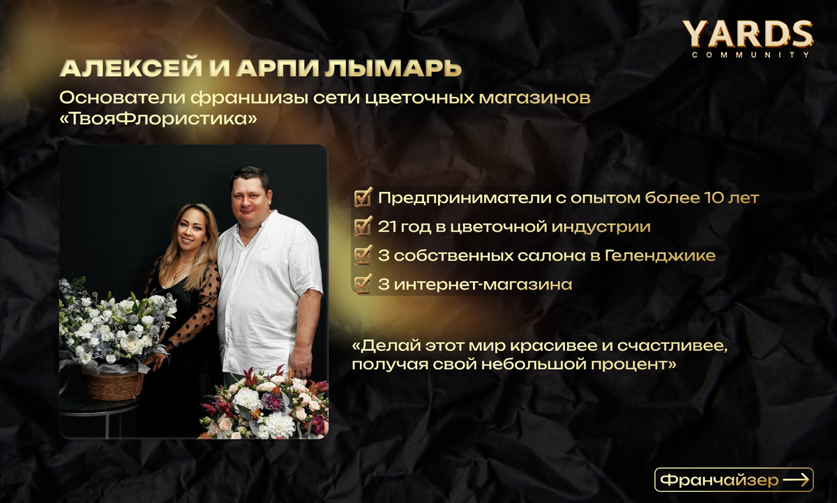 Цветочный бизнес часто воспринимают как локальный проект — салон у дома, который работает для своего города. Однако всё больше предпринимателей рассматривают эту нишу как основу для масштабируемой модели. Один из таких примеров — семейный бизнес Алексея и Арпи Лымарь, основателей сети цветочных магазинов «ТвояФлористика» из Геленджика. Сегодня их проект включает несколько салонов, интернет-магазины и готовится к развитию через франчайзинг. История предпринимателей показывает, как опыт в профессии, сильное партнёрство и системный подход позволяют превратить локальный бизнес в растущую сеть. Решение открыть собственный бизнес пришло в тот момент, когда стало ясно: накопленного опыта достаточно, чтобы работать на себя. По словам основателей, однажды было принято простое, но важное решение — больше не работать на других и строить собственный проект. К этому моменту у семьи уже был серьёзный профессиональный фундамент. Арпи работала во флористике более 11 лет и знала индустрию изнутри: от р