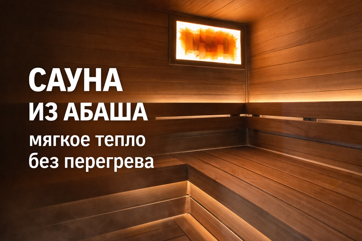 (разбор проекта из термоабаша) Комфорт в бане — это не только материалы. В этом проекте были реализованы базовые, но критически важные решения:пространство мягким по ощущениям, а правильная конструкция обеспечила стабильную работу парной. А бывает наоборот: температура высокая, но находиться внутри комфортно. Разница почти всегда в одном — материалах и правильной конструкции парной. В этом проекте мы как раз решали задачу сделать сауну, в которой тепло ощущается мягко, а не агрессивно. Основной материал этой сауны — термообработанный абаш. Это не самый распространённый вариант, но один из самых комфортных в использовании. Главное его свойство — низкая теплопроводность. Проще говоря, он почти не нагревается так сильно, как другие породы. Что это даёт в реальности: — на полках можно сидеть дольше