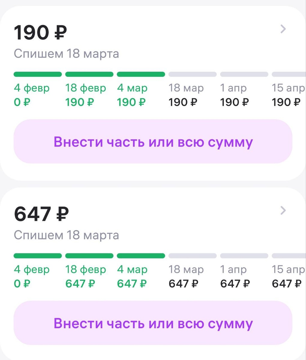 От двух пакетов пришлось отказаться, которые были с оплатой при получении. Поэтому мне очень важно сейчас сохранить лимит рассрочки что бы не отключили. Сегодня два платежа нужно внести 190 и 647. Я отложила 1750 это вы вчера прислали для новой кошечки на стерилизацию. Я не могу их трогать, мы уже записались на субботу и сумма у нас ещё не достаточная на оплату клиники. Поможете нам с этими платежами сегодня? 🙏🏼🙏🏼🙏🏼
