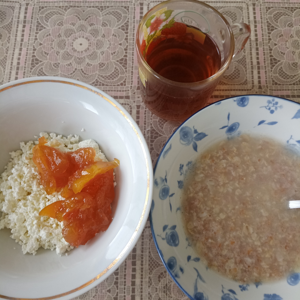 Мой завтрак был совсем какой-то пустой. Каша на воде, творог без йогурта. Хорошо хоть яблочное варенье скрасило мою утреннюю трапезу. Такое варенье мне очень нравится. Яблочки свои, душистые, пахнут обалденно! Ни за что с этой яблоней не расстанусь, хоть она и старая уже. Таких яблонь сейчас, наверное, и нет. Название её я не знаю, к сожалению.