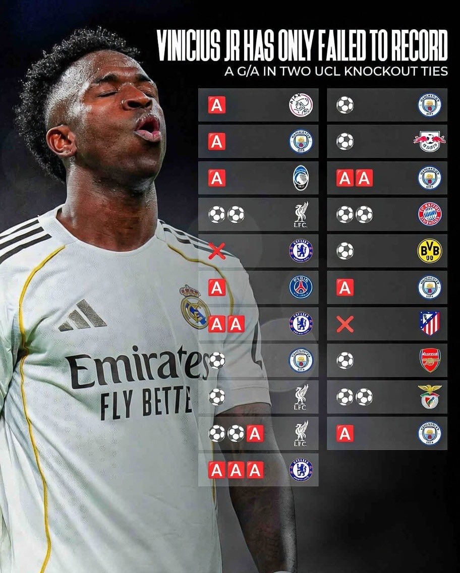 Винисиус не отмечался ни одним голевым действием лишь в двух противостояниях в плей-офф ЛЧ за всю карьеру 😳