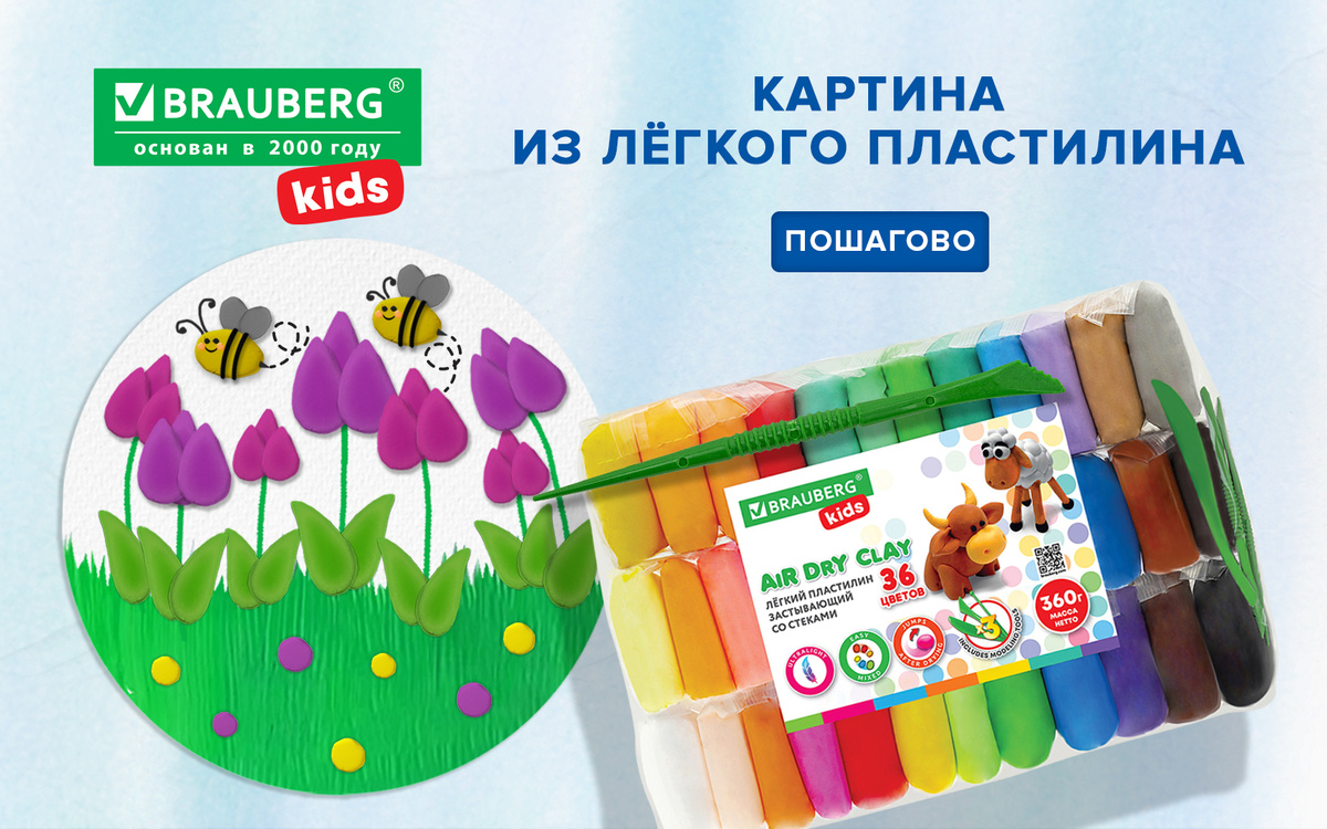 Весной всё становится лёгким и воздушным – прямо как пластилин BRAUBERG KIDS. В работе он мягкий и пластичный. Но главное его преимущество: застывает на воздухе за 24 часа. В результате получаются прочные фигурки или сувениры. Но мы решили пойти дальше и предлагаем создать настоящую весеннюю картину! Для основы вырезаем круг из плотного картона. А если решили подойти к делу серьёзно – можно взять готовый круглый холст. Выбираем самый зелёный из всех зелёных цветов. Скатываем небольшие шарики, выкладываем их на основу. С помощью зубной щётки резкими движениями протягиваем вверх. Этот приём поможет создать реалистичную и рельефную фактуру травы. С помощью зелёного маркера рисуем несколько палочек – стебельков от тюльпанов. Далее выбираем цвет бутонов – например, оттенки сиреневого или фиолетового. Скатываем небольшие шарики. Фиксируем у основания стебелька. Далее протягиваем лепесток вверх, постепенно уменьшая силу давления. При желании можно дополнительно поджать уголок, чтобы сделать е
