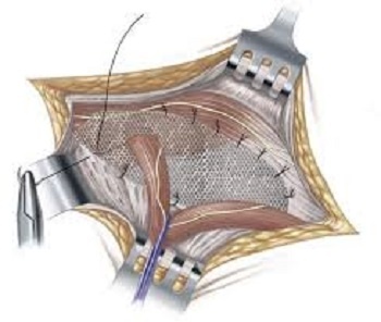 - Установка сетчатого импланта. Синтетическая сетка подшивается к окружающим тканям, создавая прочный каркас.
