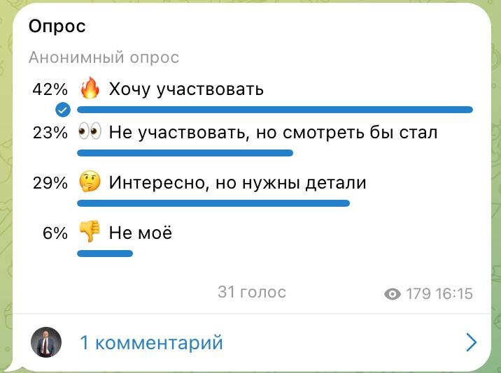 Я в шоке 🤯 На прошлой неделе спросил вас: зашла бы идея реалити-шоу про франшизу на YouTube? Вот результаты: 🔥 42% хотят участвовать 👀 23% не участвовать, но смотреть бы стали 🤔 29% интересно, но нужны детали 👎 6% не моё 24 голоса. 92% аудитории так или иначе заинтересованы. Для меня это сигнал: надо делать. Напомню идею: 5 предпринимателей. 3-5 мес. Камеры. Показываем бизнес, ставим цель, идём к ней на камеру. Честно, с цифрами, без прикрас. 1️⃣ Для тех, кто создаёт франшизу с нуля: покажем весь путь от идеи до первых продаж. 2️⃣ Для тех, у кого уже есть франшиза: поставим цель по росту и пойдём к ней вместе. Что получает участник: 📌 Узнаваемость бизнеса и личного бренда 📌 Контент о вашем бизнесе на YouTube 📌 Реальная работа над франшизой с постановкой целей 📌 Продажи и деньги (если постараетесь) 📌 Новый интересный опыт Я не буду сейчас расписывать все условия. Потому что с каждым хочу лично встретиться в зуме, понять ваше желание, намерение, видение. И вместе выработ