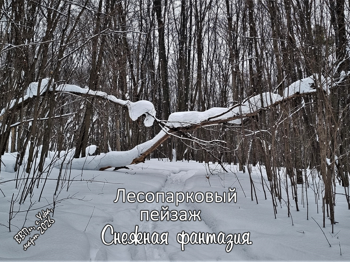 Когда гуляешь зимой по тропинкам густого лесопарка, где нет простора, неба, воздуха, где, по определению, не может быть видовых пейзажей, невольно погружаешься во внутреннюю жизнь леса. Начинаешь замечать и отдельные могучие стволы, и семейные деревья, и хороводы кустарников. Видеть перед глазами молодость, зрелость, старость - переплетённые ветвями деревья, стоящие, сгибающиеся, упавшие. Весь этот безмолвный лесной мир ближе к концу зимы засыпается толстым слоем снега, который после февральских метелей и вьюг превращается в мир снежных фантазий...