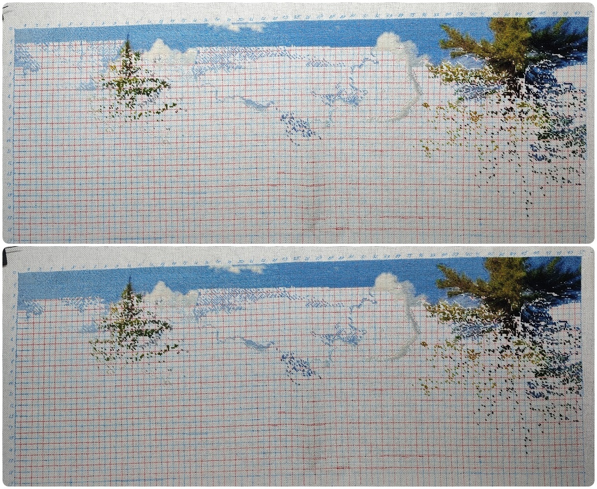 Вчера с таким удовольствием вышивала свой пейзаж. Все-таки, когда вот так начинаешь скучать по процессу и потом к нему возвращаешься - это здорово! Такой запал! Почти как при новом старте. И на вышивала я вчера 1110// Вышивала левый край. Небо. Закончила 2й ряд и уже начала третий. Он у меня идет теперь слева на право, то есть по тому же левому краю. А потому, прямо не отрываясь, я сразу заполняла оба ряда. И сегодня.. Рулеточка осталась на стороне пейзажа. Так что продолжу. В участке неба там остался один цвет и не так уж и много. Так что захвачу еще и макушку сосны однозначно. Здесь, как я и думала, одного вечера мне не хватило, чтобы финишировать. Связала белую часть обвязки и только начала голубой рядочек и время мое истекло... Вообще, мои рукодельные вечера не такие уж и длинные... Человек я рабочий. Добираюсь до рукоделия часов в 6 вечера. Начинаю с вышивки, часов до 9 вечера. А потом пару часов на вязание. Поэтому, в принципе, все мои проекты можно связать куда быстрее, если чел
