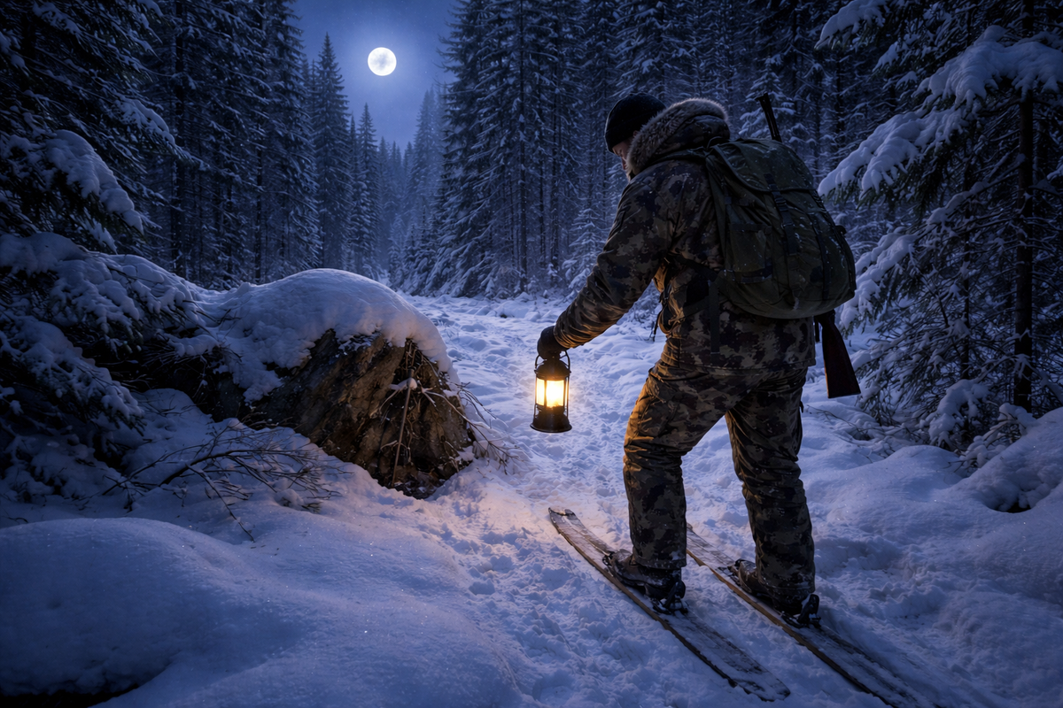 Зимой в тайге ночь иногда бывает светлее дня. Когда небо чистое, мороз крепкий, а над лесом поднимается полная луна, снег начинает отражать её свет так ярко, что можно идти по тропе почти без фонаря. В такие ночи старые промысловики иногда выходят проверять капканы, потому что холод держит следы чёткими, а лес становится тихим и спокойным. Промысловик Егор вышел из своей избушки поздним вечером. Печь в избе уже натопилась, в чугунке тихо томился чай, но он решил пройтись по ближним капканам. Ночью обещали сильный мороз, и иногда зверь попадается именно в такие часы. Он надел тёплую куртку, взял рюкзак, карабин и вышел на крыльцо. Луна висела высоко над кедрами. Снег вокруг светился мягким голубым светом, а тени деревьев ложились длинными полосами по земле. Тайга была почти беззвучной. Только где-то далеко треснула замёрзшая ветка. Егор встал на широкие лыжи и пошёл по своей тропе. Капканная дорога тянулась через кедровый распадок — небольшую долину между двумя склонами, где росли стары