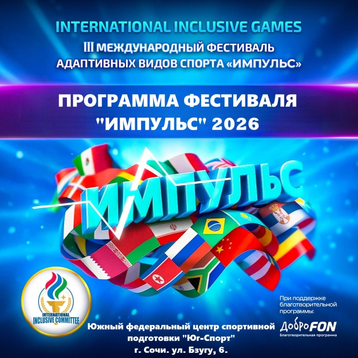 Организаторы III Международного фестиваля адаптивных видов спорта «Импульс» (International Inclusive Games) опубликовали официальную программу мероприятия. Фестиваль пройдёт с 25 по 29 марта 2026 года на базе Южного федерального центра спортивной подготовки «Юг-Спорт» в Сочи (ул. Бзугу, 6). 📍 Программа фестиваля 🌟 25 марта (среда) День приезда и регистрации участников. Прохождение мандатной комиссии. Экскурсионная программа в течение дня. 🌟 26 марта (четверг) 12:00 — старт соревновательной программы. 18:00 — торжественная церемония открытия с парадом стран, приветствиями почётных гостей и концертом с участием звёзд российской и зарубежной эстрады. Ведущий — Денис Стойков. Экскурсии в течение дня. 🌟 27 марта (пятница) 10:00–15:00 — соревнования по утверждённым видам спорта. Экскурсии по предварительной записи. 🌟 28 марта (суббота) 10:00–20:00 — экскурсии. Отъезд команд. 🌟 29 марта (воскресенье) Экскурсии по предварительной записи. Отъезд команд. Организаторы отмечают, ч