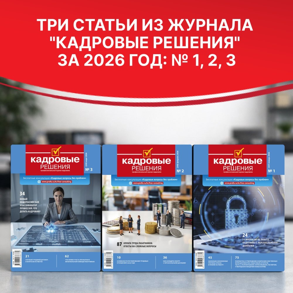 !!! Подборка материалов из журнала «Кадровые решения»-2026 плюс образцы заполненных документов: следим за нововведениями и помогаем решать практические задачи. 1. Как аннулировать трудовой договор, если работник не вышел на работу № 1/2026 2. Особенности регулирования трудовых отношений в 2026 году № 2/2026 3. Новый Общероссийский классификатор профессий: что делать кадровику № 3/2026 Забрать подборку