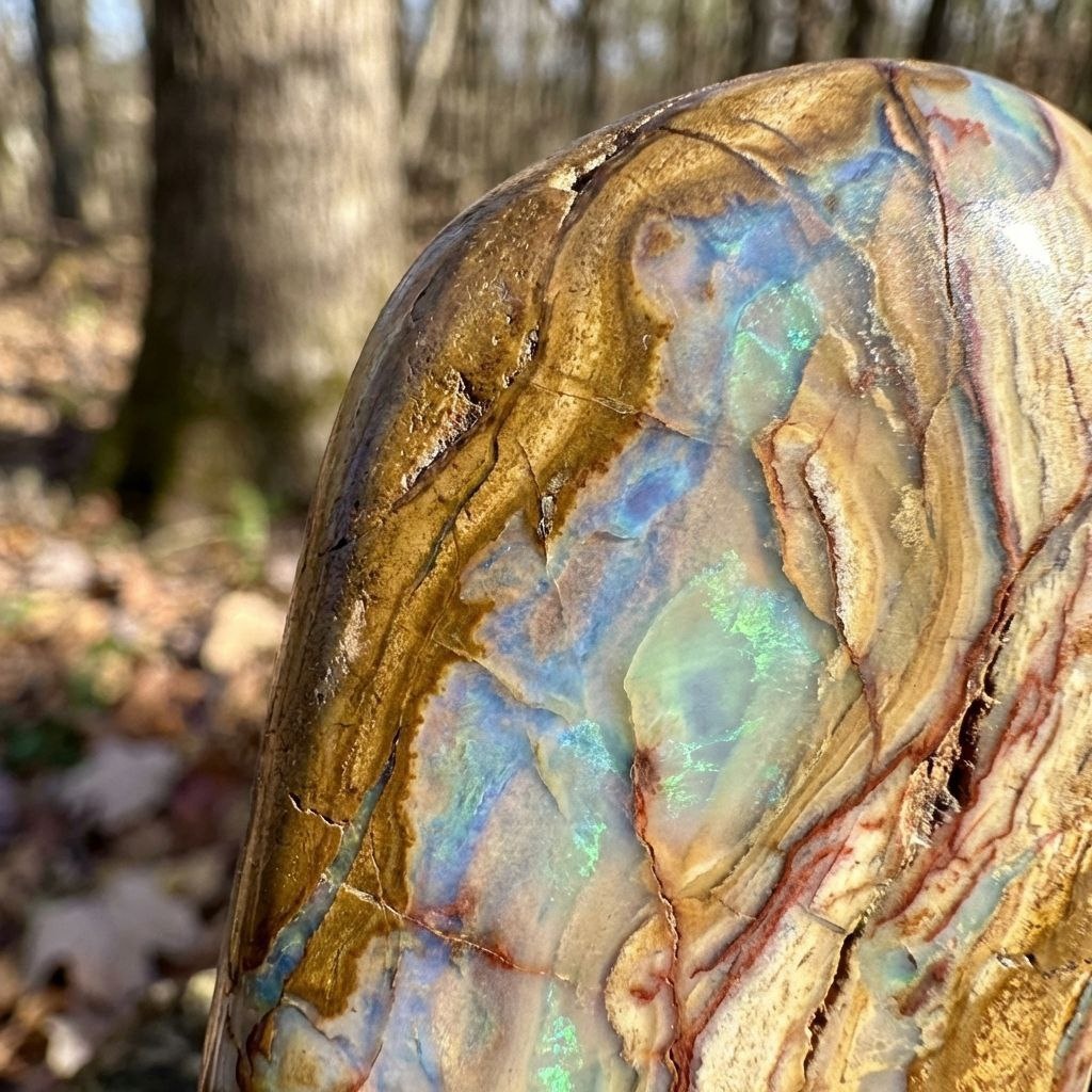 Здравствуйте! Сегодня поговорим про очень интересный минерал - древесный опал. Это окаменевшее дерево, где ткань ствола замещена миллионами микрокристаллов кремнезёма. Что делает этот камень уникальным? Он буквально хранит в себе дыхание древних лесов — история минерала может насчитывать миллионы лет. В Древнем Риме такие экземпляры считались воплощением связи с Духом Предков. По легенде, прикосновение к древесному опалу помогало слышать свою внутреннюю мудрость и принимать решения, опираясь на опыт рода. Интересны этапы его формирования. Древесный опал формируется, когда органическая материя постепенно замещается гидротермальным кремнезёмом, при этом сохраняется рисунок древесины. С научной точки зрения — это «фотография" флоры Мезозоя, застывшая в минерале. Формула опала SiO₂·nH₂O проста, и в то же время таит в себе настоящее чудо. Её основа - диоксид кремния (SiO₂), как у кварца. Но отличие в том, что между молекулами содержится переменное количество воды (nH₂O — до 20% от массы!).