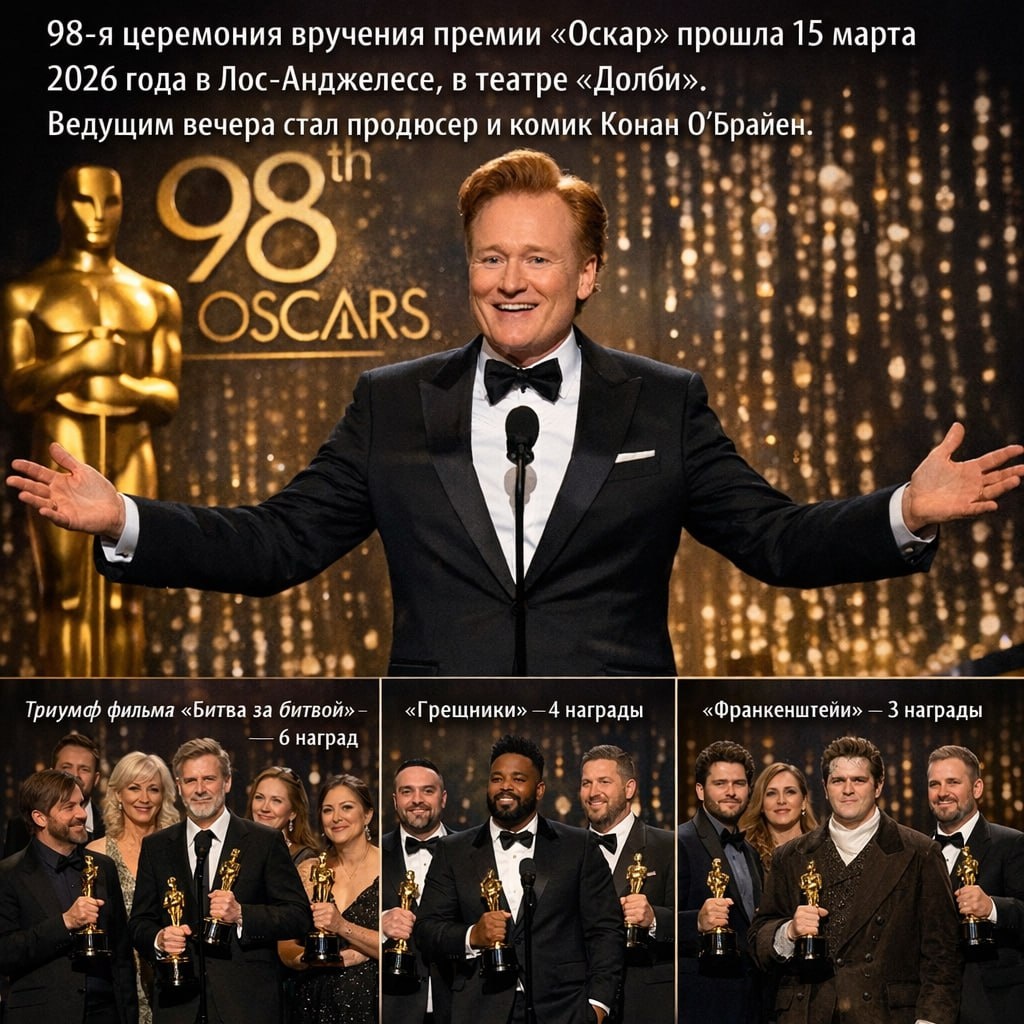 ! 🏆 Победители «Оскара‑2026» 🏆 15 марта в Лос‑Анджелесе прошла 98‑я церемония вручения премии «Оскар». Главный триумфатор — фильм «Битва за битвой» Пола Томаса Андерсона: он взял 6 статуэток, включая главные награды. 🎬 Лучший фильм «Битва за битвой» 🎥 Лучший режиссёр Пол Томас Андерсон — «Битва за битвой» 👨🦰 Лучшая мужская роль Майкл Б. Джордан — «Грешники» 👩🦰 Лучшая женская роль Джесси Бакли — «Хамнет» 👨🦱 Лучшая мужская роль второго плана Шон Пенн — «Битва за битвой» 👩🦱 Лучшая женская роль второго плана Эми Мэдиган — «Орудия» ✍️ Лучший оригинальный сценарий Райан Куглер — «Грешники» ✍️ Лучший адаптированный сценарий Пол Томас Андерсон — «Битва за битвой» 🎞 Лучший монтаж «Битва за битвой» 📸 Лучшая операторская работа Отем Дюральд Аркапоу — «Грешники» 🎵 Лучший оригинальный саундтрек Людвиг Горанссон — «Грешники» 🎤 Лучшая песня Golden — «Кейпоп‑охотницы на демонов» 🖌 Лучшие визуальные эффекты «Аватар: Огонь и пепел» 🔊 Лучший звук «F1» 🧸 Лучший аним