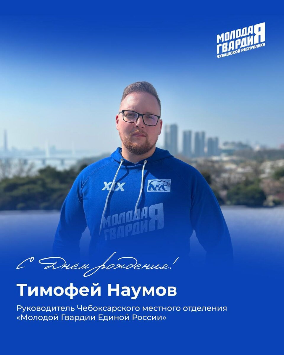! В этот день его отмечает Тимофей Наумов — член Регионального штаба и руководитель Чебоксарского местного отделения «Молодой Гвардии Единой России». Мы знаем тебя не только как замечательного директора школы, но и как доброго, позитивного и отзывчивого члена нашей команды. Твоя энергия и оптимизм делают мир вокруг светлее, а поддержка — надежнее. Желаем тебе оставаться таким же жизнерадостным, с лёгкостью покорять все вершины и всегда чувствовать тепло и поддержку близких! С праздником!