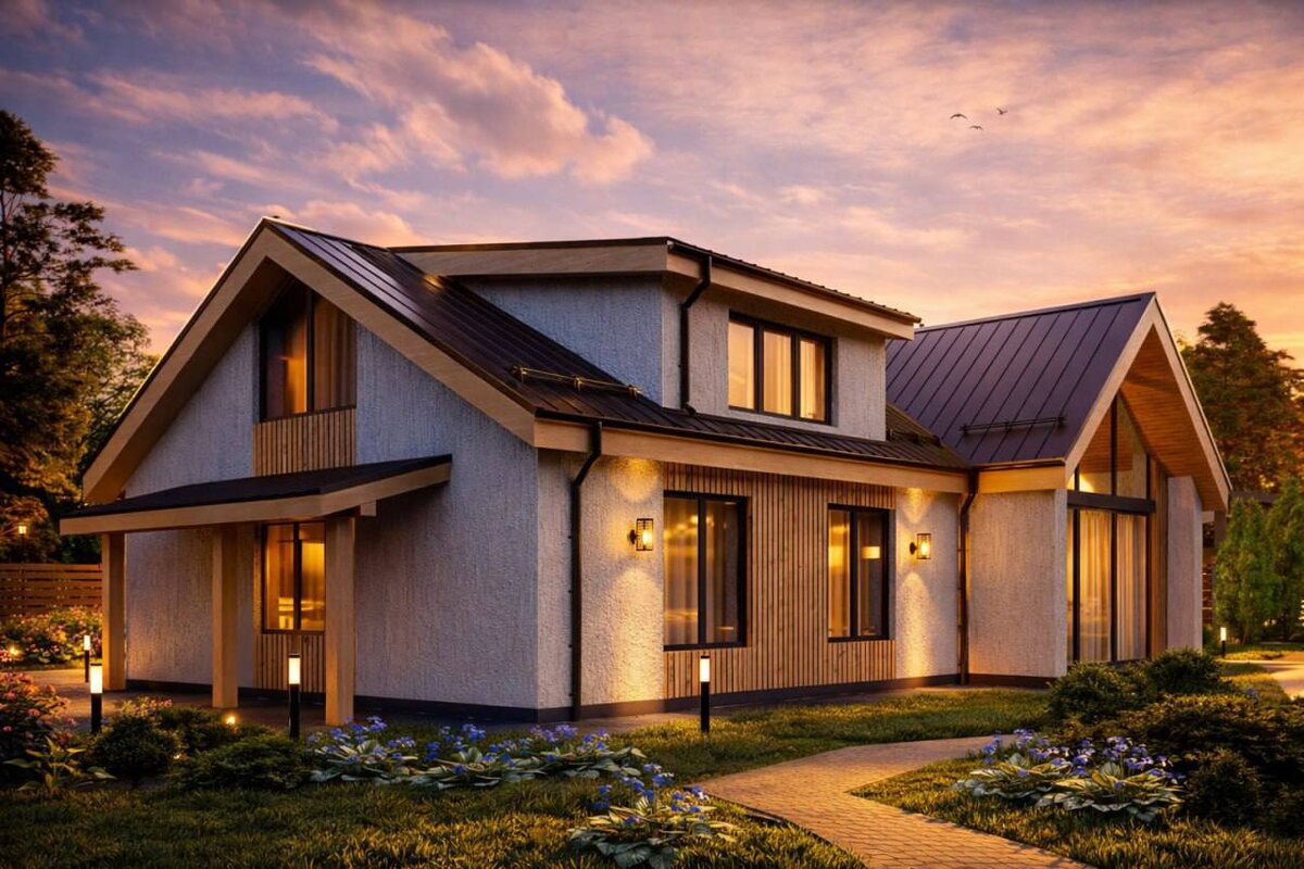 - Кол-во спален - 2 Современный одноэтажный дом с мансардой из автоклавного газобетона, с габаритами по наружному контуру 15,40х10,40 м. Дом выполнен в современном стиле, с комбинированным фасадом из декоративной штукатурки и планкена, имитирующего тёплую древесину. Планировочное решение дома сочетает современную эстетику с высокой эргономикой пространства. На первом этаже расположены кухня-гостиная с огромным панорамным окном во всю стену, которое придаёт дому особую изюминку, а также холл с лестницей, прихожая, две спальни, санузел, ванная, гардероб и котельная-постирочная. На мансардном этаже планируется создание зоны отдыха «chill out».