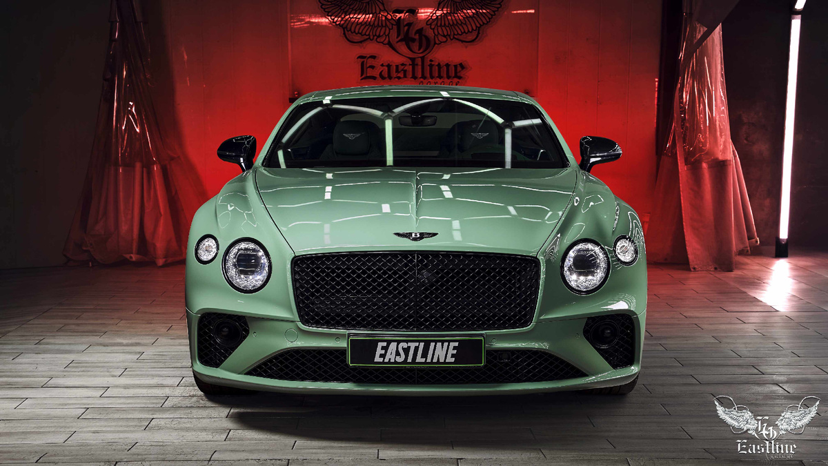 Привет! С вами тюнинг-ателье Eastline Garage и сегодня мы знакомим вас с нашим новым проектом – это Bentley Continental GT. Очень красивый автомобиль, очень благородный силуэт. Реально ли сделать Bentley еще круче, чем с завода? Конечно, ведь наши мастера – волшебники! Итак, перед вами Continental GT в очень красивом фисташковом цвете с потрясающим зеленым салоном, оформленным карбоном в стиле Mansory. Сначала поговорим о внешности автомобиля. Он получил яркий фисташковый цвет в результате оклейки кузова полиуретаном. Это сделано очень качественно и может показаться, что Continental GT перекрашен: все проемы и элементы, где мог проглядывать родной цвет, тщательно заклеены пленкой. Цветной полиуретан не только позволяет освежить облик авто, но и помогает защитить кузов. К плюсам его использования относится и то, что его будет легко снять, если владелец снова захочет изменить внешность любимого купе. При этом под пленкой сохранится кузовное покрытие в изначальном состоянии, без следов эк
